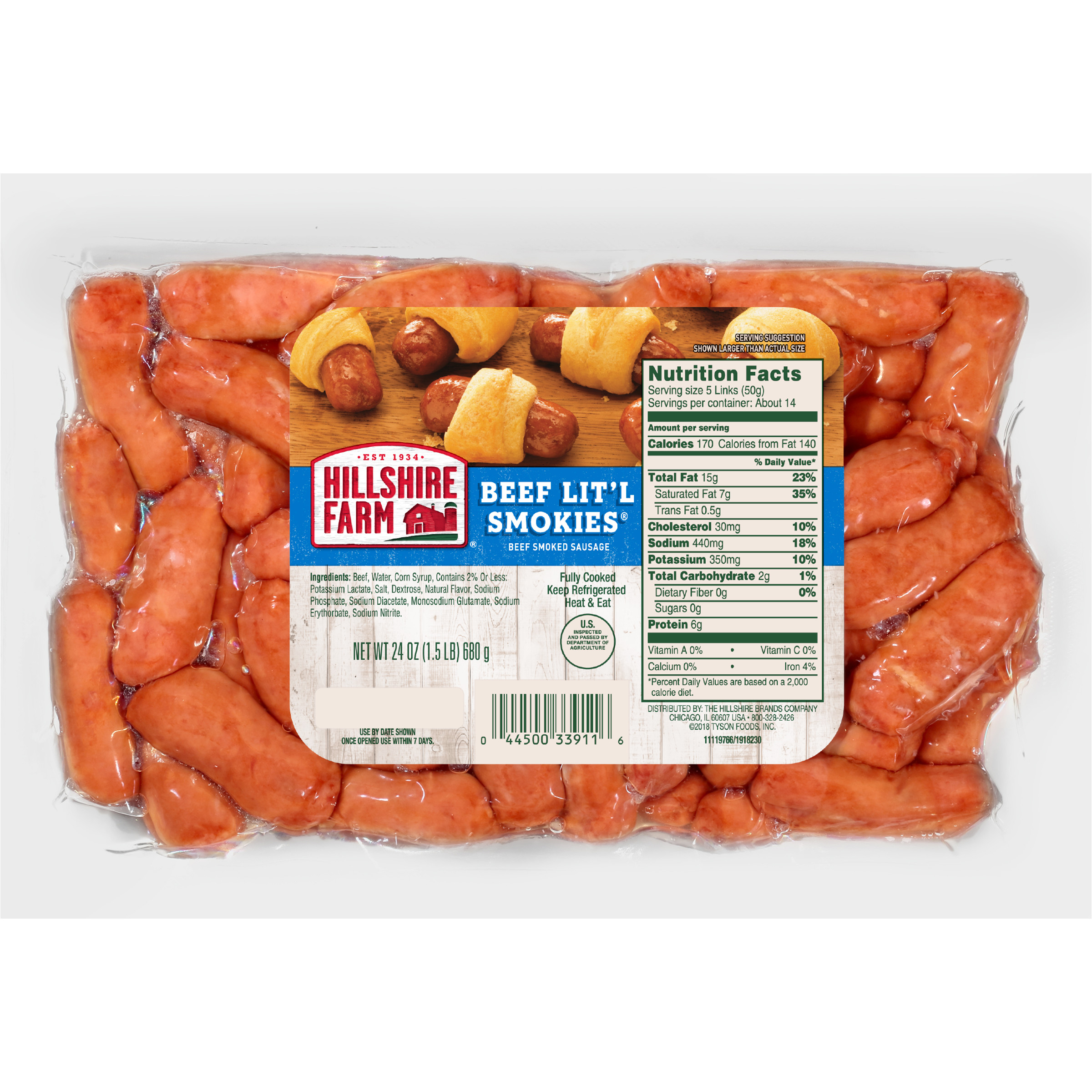 Calories in Hillshire Farm Beef Lit'l Smokies | CalorieKing How many calories in Hillshire Farm Beef Lit'l Smokies 160 Calories Quantity link (1.8 oz) Serving Loading Compare... Nutrition Facts Calorie Burn Time How long would it take to burn off 160 Calories of Hillshire Farm Beef Lit'l Smokies? Swimming 13 minutes Jogging 18 minutes Cycling 24 minutes Walking 45 minutes