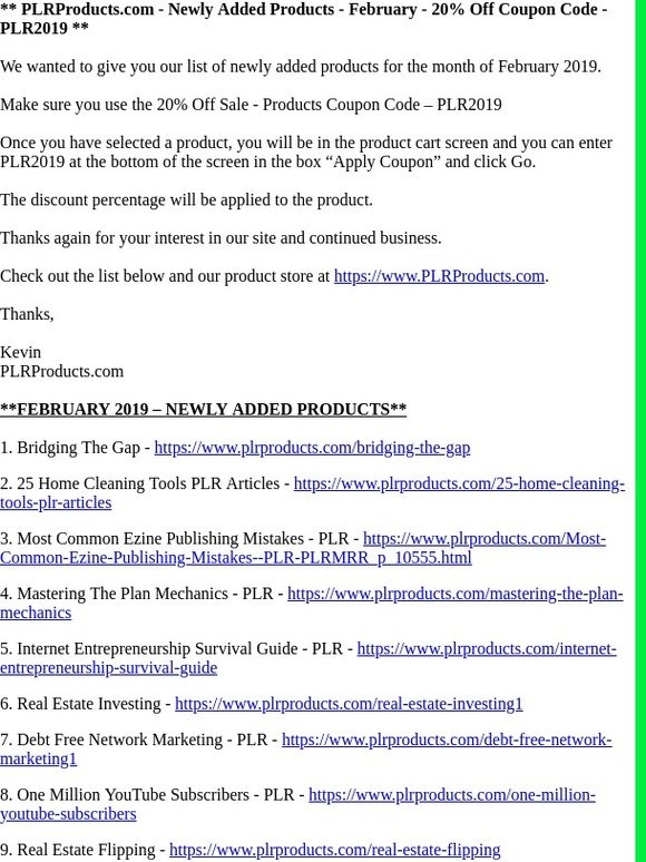 Laser-Targeted Marketing 2019 Made Easy - PLRProducts.com 35% Off Holiday Sale - All Products. Use Coupon Code SALE35 At Checkout. Shopping Cart (0) ... Laser-Targeted Marketing 2019 Made Easy; ... Free Reports Exposed (PLR / MRR) $5.99. Add To Cart. Quick View. Wired To Succeed (PLR / MRR) $7.99. Add To Cart.