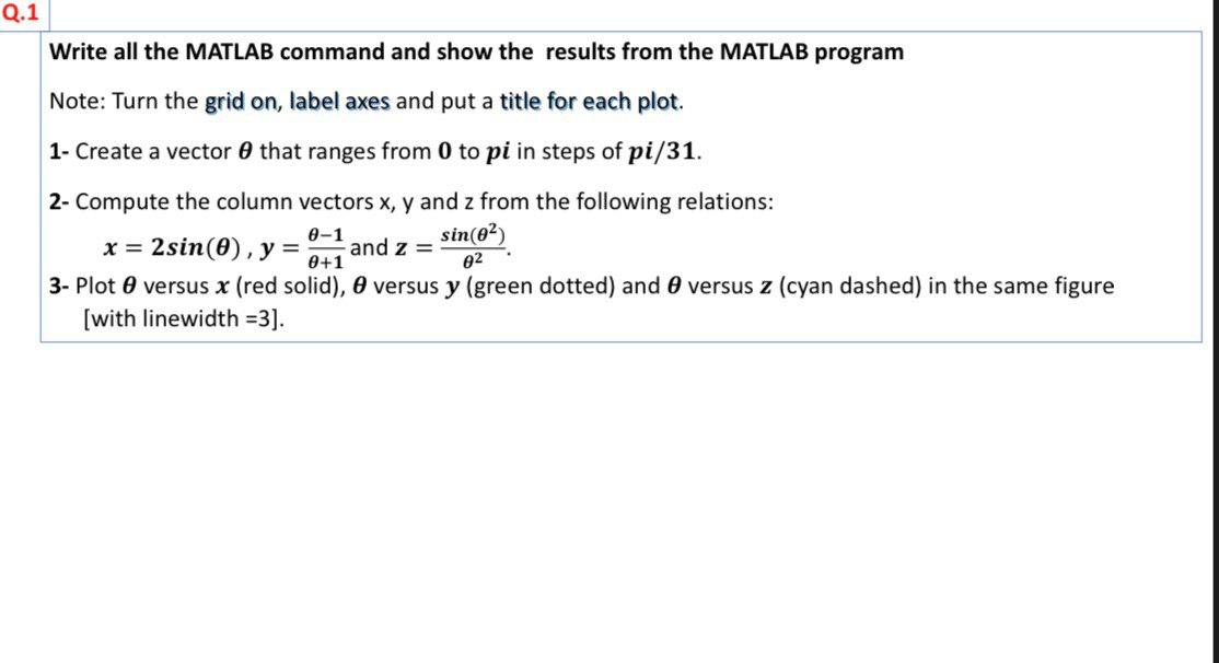 Solved Q.1 Write all the MATLAB command and show the results ...