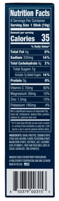 REVIEW: We Tried DripDrop, an Electrolyte Powder Athletes Use ... - Insider DripDrop as an ORS DripDrop follows this recommended formula and comes in single-serving sticks in three flavors (watermelon, lemon, and berry). Each 10-gram serving contains 35 calories and seven grams of sugar, which is half the sugar of a comparable serving of a sports drink like Gatorade.