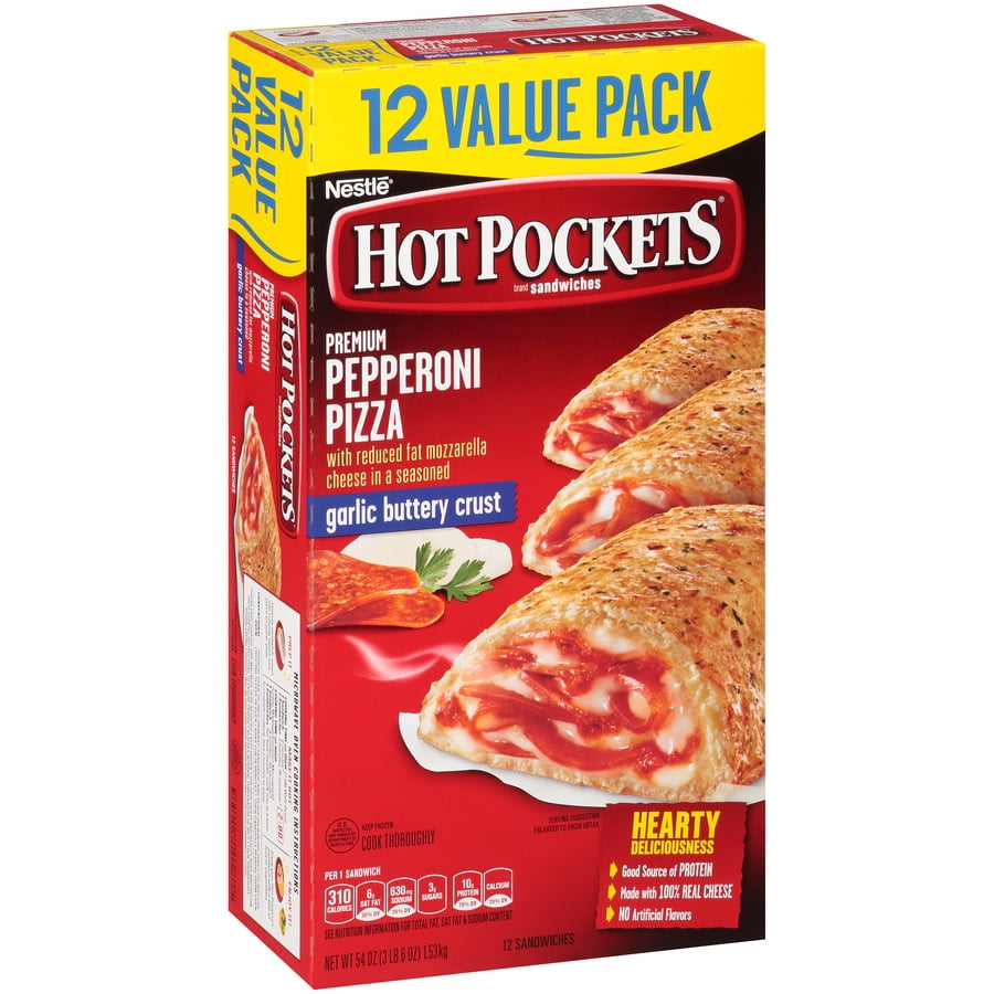 Hot Pockets Premium Pepperoni Pizza Crispy Crust Frozen ... - H-E-B Hot Pockets Pepperoni Pizza sandwiches are made with pepperoni and 100% real reduced fat mozzarella cheese, wrapped in a delicious crispy crust. This delightful frozen snack is a good source of protein, with 10 G of protein per serving, and delivers bold flavors that are great for anyone who loves the classic taste of pepperoni and cheese pizza.