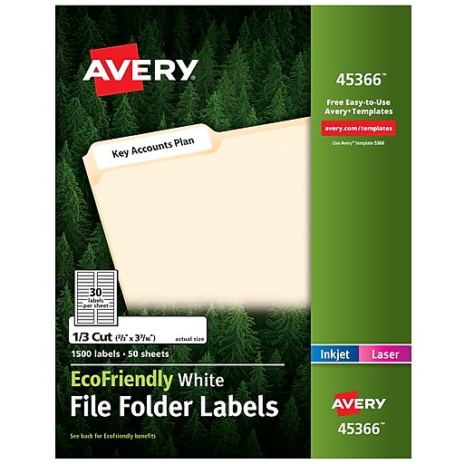 Avery EcoFriendly Laser/Inkjet File Folder Labels, 2/3" x 3 7/16", White, 30 Labels/Sheet, 50 Sheets/Box (45366)
