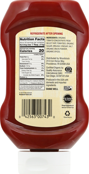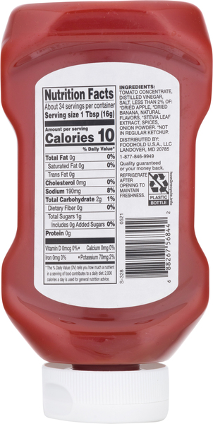 What's New with the Nutrition Facts Label | FDA Daily Values for nutrients have been updated, which may make the percent Daily Value higher or lower on the new Nutrition Facts label. As a general guide: 5% DV or less of a nutrient per serving ... Simple Truth Organic® Tomato Ketchup, 20 oz - Kroger Nutrition Facts servings per container Serving size 1tbsp (17 g) Amount per serving Calories 15 % Daily value* Total Fat 0g 0% Saturated Fat 0g 0% Trans Fat 0g Cholesterol 0mg 0% Sodium 150mg 6.52% Total Carbohydrate 4g 1.45% Dietary Fiber 0g 0% Sugar 4g Protein 0g Calcium 0mg 0% Iron 0mg 0% Potassium 70mg 2% Vitamin D 0mcg 0%