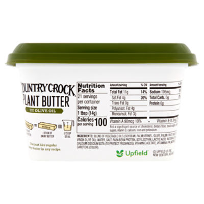Country Crock Butter Nutrition Label - This Nutrition Learn more information about country crock butter nutrition label. In this article we'll discuss country crock butter nutrition label. GMO-free Food, 2.5 Liters Of Water And 10,000 Steps Per Day - Nutrition Or Marketing. What Should A Woman Eat At Different Ages: Nutritionist's Advice. Nutrition Facts for Country Crock Plant Butter Sticks w/ Olive Oil Nutrition Facts. Serving Size. tbsp. 1 tbsp = 14g. Amount Per Serving. 100. Calories % Daily Value* 17%. Total Fat 11g. 25% Saturated Fat 5g Trans Fat 0g. 0%. Cholesterol 0mg. 5%. ... Top Country Crock Items. Country Crock Original Vegetable Oil Spread Tub. 1 tbsp (14g) Log food: Country Crock Spreadable Margarine w/ Calcium Tub. 1 tbsp (14g) Country Crock - Wikipedia Country Crock is a food brand owned by Upfield. It originally sold spreads such as margarine (and cheese for a limited time), but later extended to side dishes, particularly mashed potatoes and pasta, made by Hormel under license. The original Shedd's brand was a product of Shedd-Bartush Foods based in Detroit.