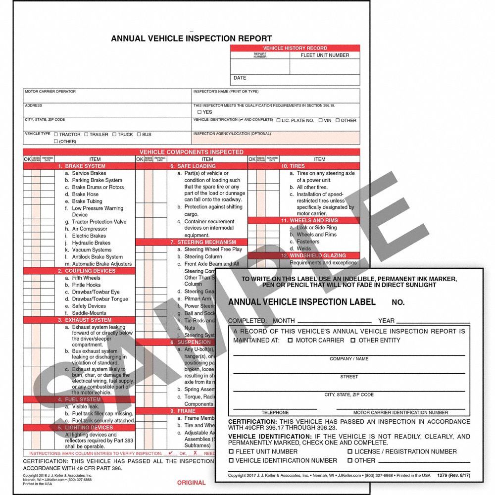 JJ KELLER Annual Vehicle Inspection Form: Carbonless, 2 ... - Grainger JJ KELLER Annual Vehicle Inspection Form: Carbonless, 2 Plies, 10 PK Item 52HM40 Mfr. Model 4024613 Product Details Catalog Page 964 With Carbon/Carbonless Carbonless Size 9-1/2 x 11 in Number of Plies 2 Format Continuous; w/Decal Language English Application to Vehicle Type Annual Vehicle Inspection Forms | J.J. Keller Helps you comply with 49 CFR Part 396 Annual Vehicle Inspection requirements. (37) Annual Vehicle Inspection Report, 2-Ply, Carbonless - Stock Snap-out format, 8-1/2" x 11-3/4" (22) Annual Vehicle Inspection Report (w/ Carbon) + Label - Retail Packaging Includes 3-ply form plus vinyl label w/ mylar laminate. (15)